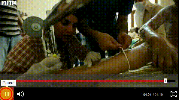 Dr Rola Hallam, Hôpital Atareb, Alep, le 26 Août 2013, interviewant des victimes présumées d’une attaque à la bombe incendiaire contre une école dans le village de Urm al-Kubra, à son arrivée. [Dans Panorama Saving Syria’s Children (Sauver les enfants de la Syrie), BBC One, le 30 Septembre 2013]